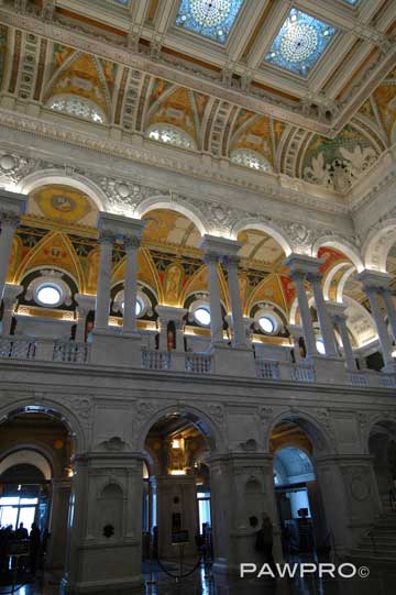 Monday Pawpro took advantage of the biannual open house offered in the Main Reading Room of  The Library of Congress within the Thomas Jefferson Building just across the street from the U.S. Capitol.  What a great space surrounded by an ever-growing collection of print materials so vast it boggles the mind.  The Library of Congress calls it, ” . . . the world’s largest repository of knowledge and creativity, with 145 million items in its collections . . .”  I overheard one employee saying the collection grows by 10,000 pieces daily!  And, yes they still have a functioning card catalog which has become less of a research tool and more of a historical relic for young visitors.