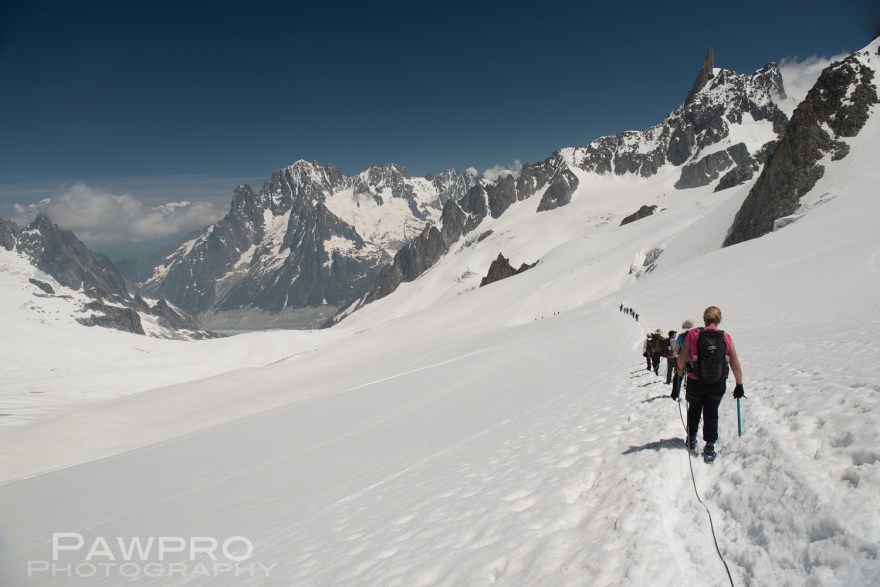 A group of 12 of us staying in Chamonix were picked up early by two guides (Mountain Spirit Guides for our glacier hike. We had all previously communicated with the guides about having suitable boots that can accommodate crampons, and the rest of the gear, ice ax and harness, was supplied. We each brought our own lunch. We had planned to step out of our hotel’s front door at Hotel l’Heliopic and head up the Aiguille du Midi cable car, but the lift, literally just outside the front doors, wasn’t working. We were to hike down the ridge from Aiguille du Midi to Pointe Helbronner, a four hour hike across Vallée Blanche to the Italian side of the mountain range overlooking Courmayeur, but it wasn’t to be with the Midi cable out of order. That was a huge disappointment as I had hoped to get some early morning photos from this famous vantage.