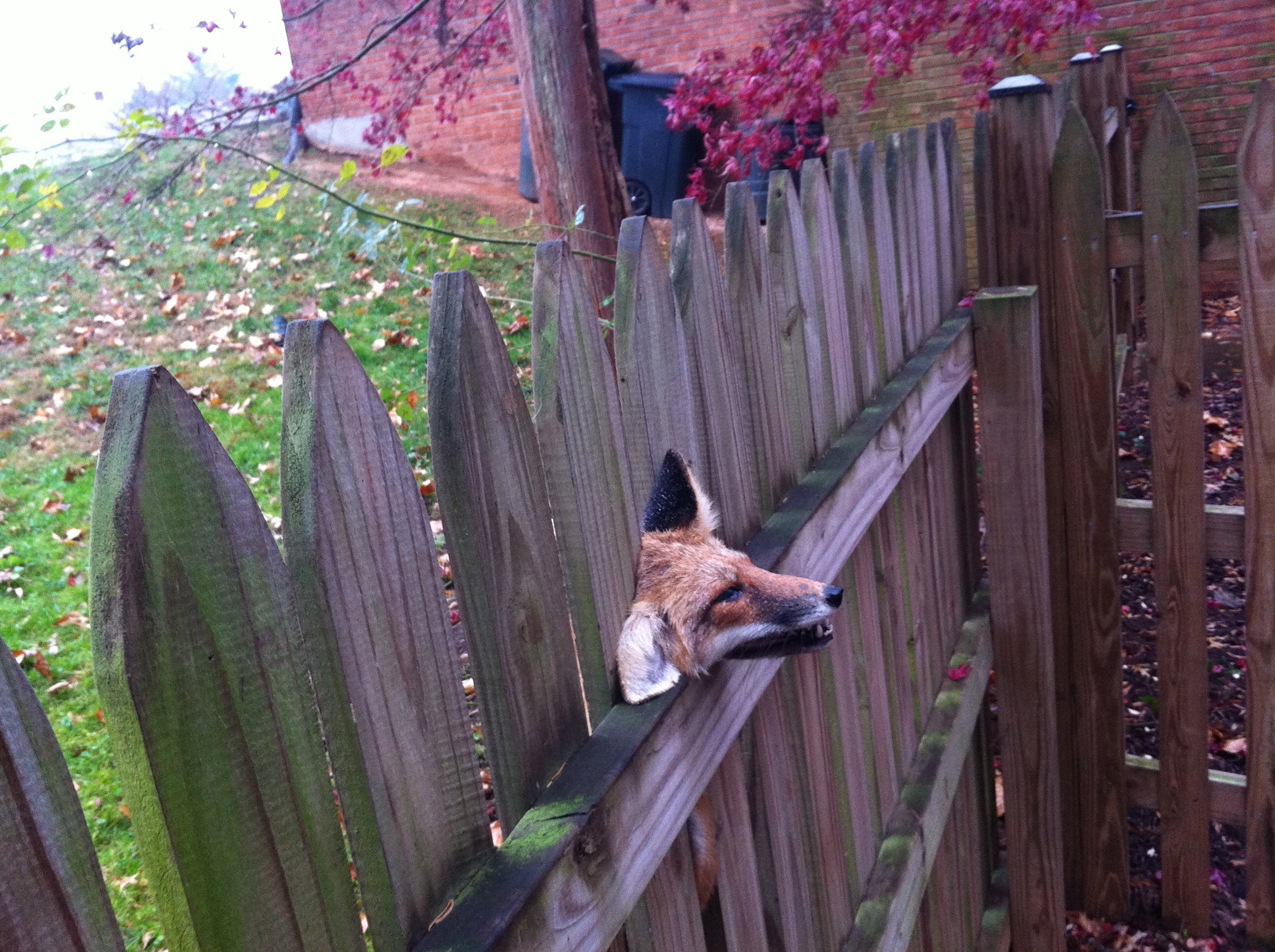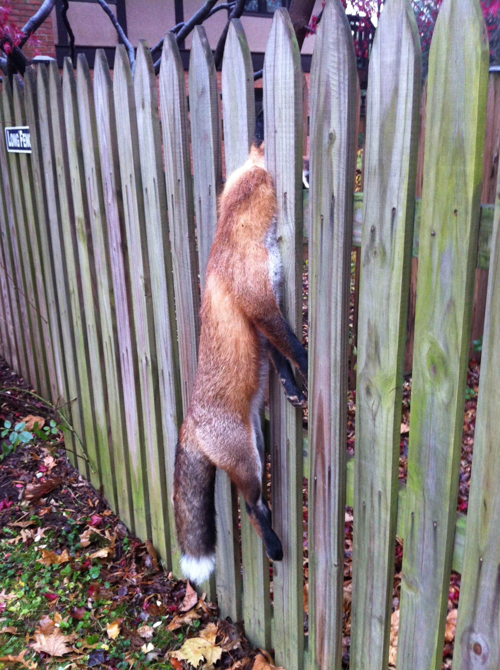 This goes into the category of, “Don’t see this everyday.” and “A strange thing happened on our way to school.”. Yesterday while standing at my son’s bus stop, we noticed this from afar, but thought it was a gag. Today, we took a closer look, since it was still there. No gag! Looks like this fox crossed one fence too many, lost his footing and fell into a tight and unfortunate position.