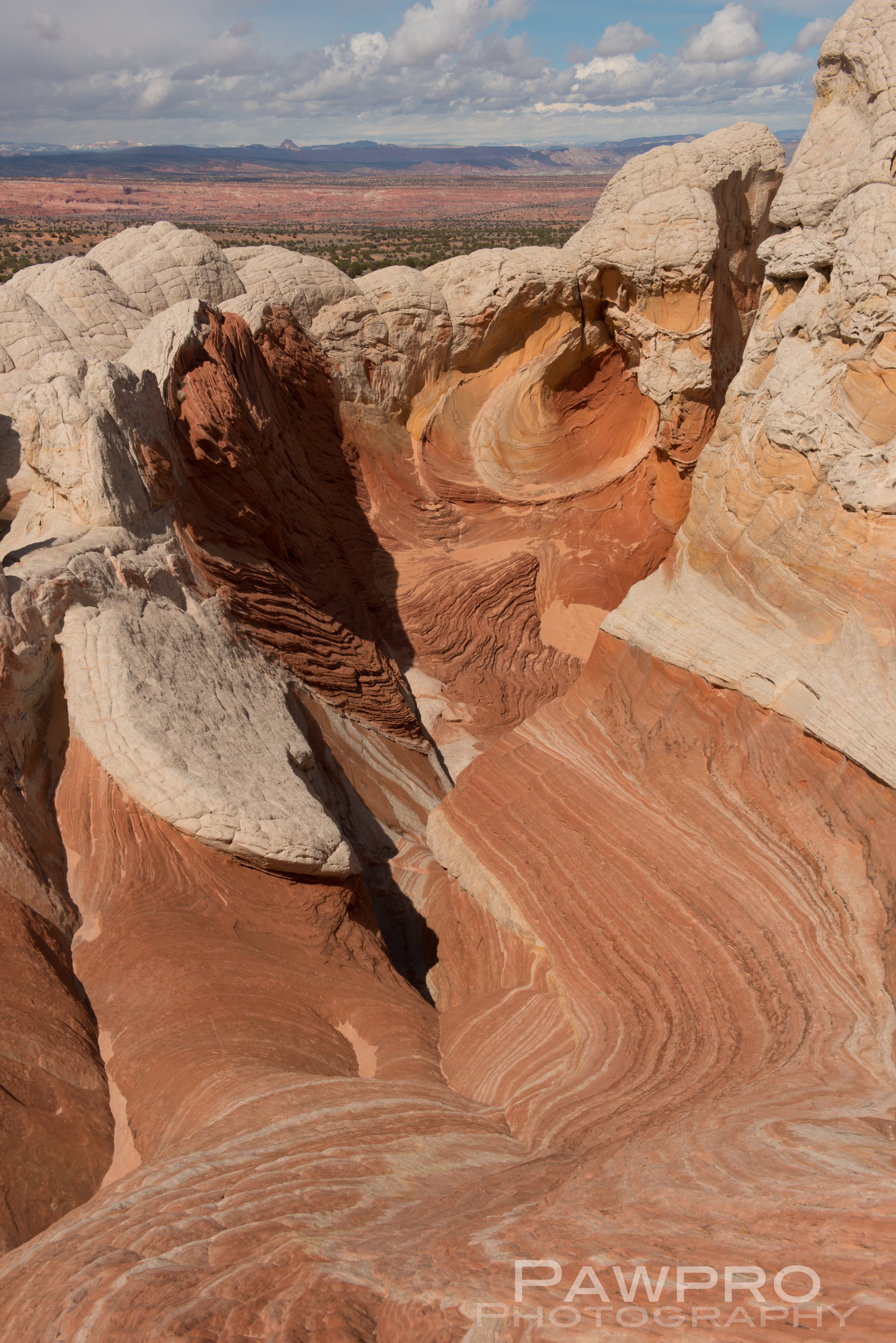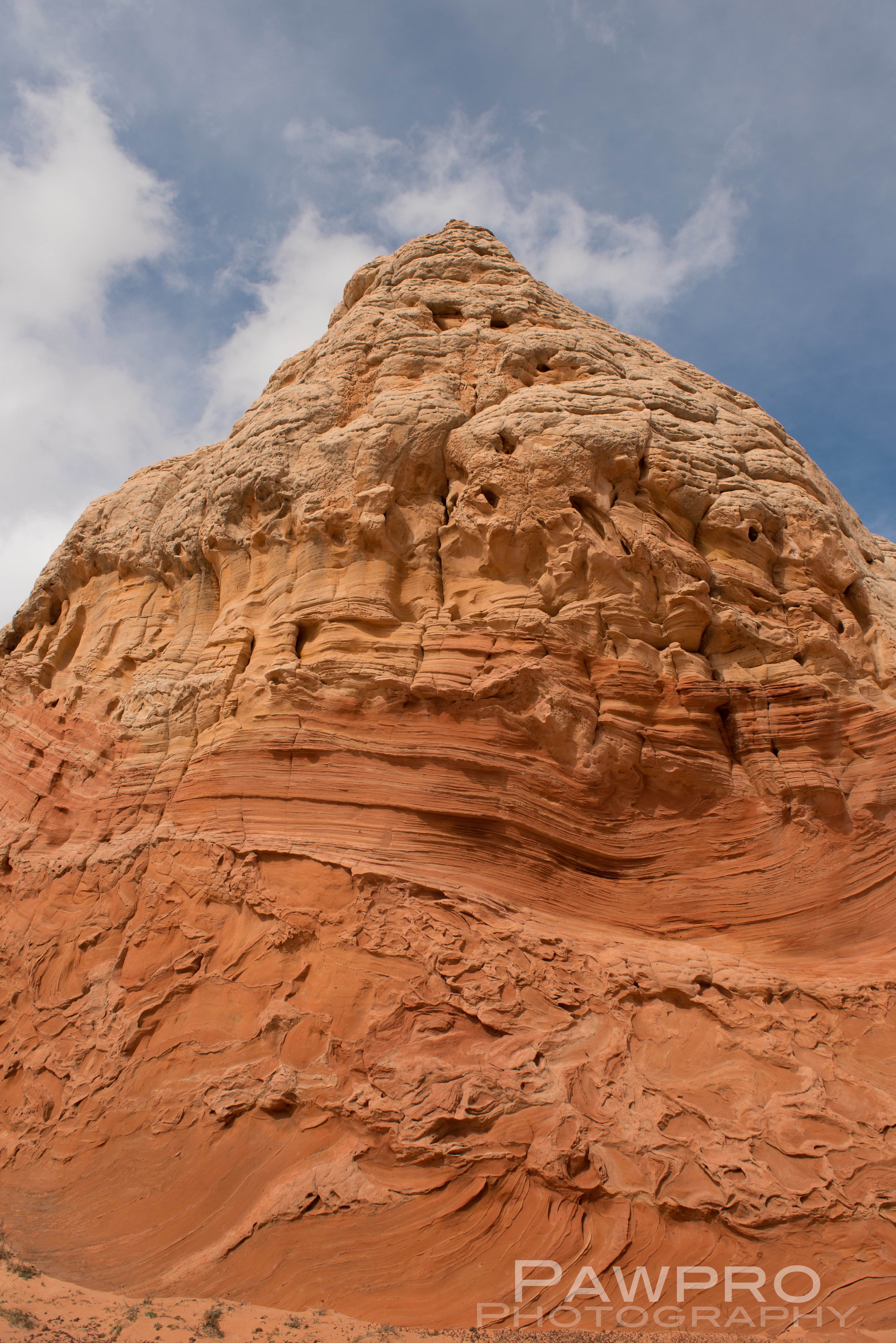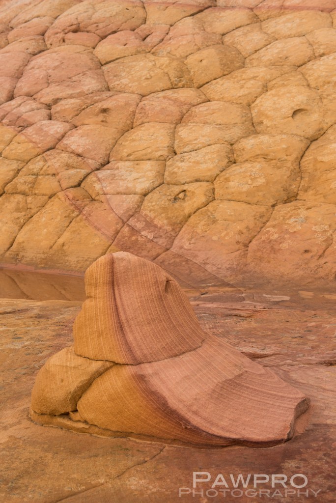 Geologically, White Pocket is one of a kind with its relatively thin, drippy coating of white stone resembling cauliflower or brain matter on the surface–giving rise to the lunar sensation. Just beneath is the striated, slick rock, sedimentary, Navajo, red sandstone of various hardnesses, so common to the area.