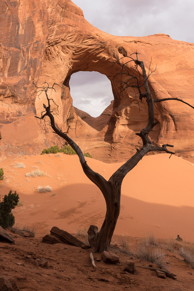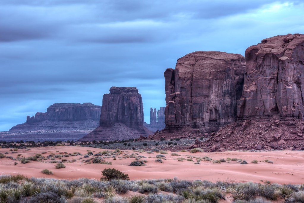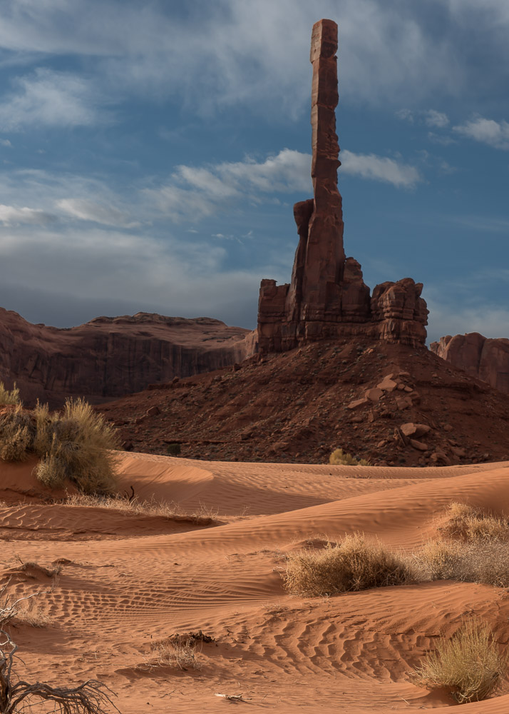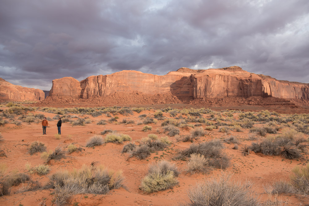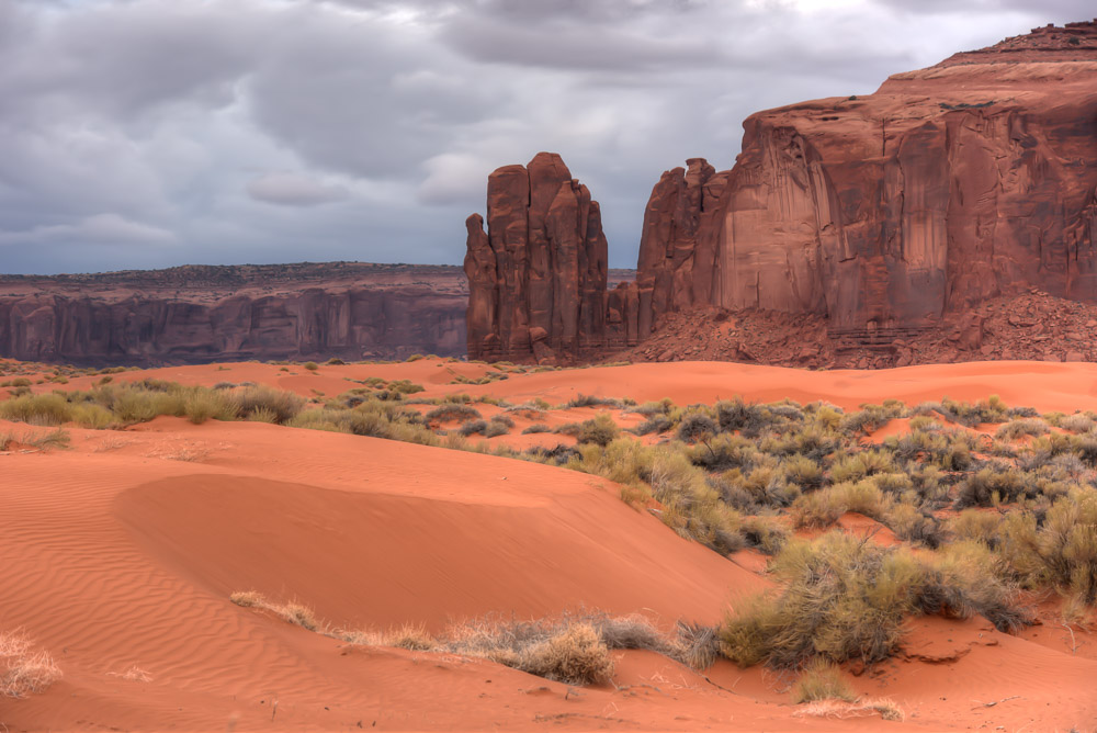 I scheduled a guide with Phillips Photography Tours for sunrise. Tule (pronounced like the Swedish car box brand) met me in the lobby of the hotel and within minutes we were headed down the dirt and gravel road beyond where tourist are allowed to venture on their own. The mittens were starting to emerge from the darkness. The tour owner had been thorough enough to send me an email the night before to let me know the weather was likely to be very cloudy at our original meeting time, so we pushed the start time to a little later. Tule took me out to the Totem Pole, a red rock spire once, and probably last, climbed by Clint Eastwood as he filmed the movie Eiger Sanction in 1974. The film industry has had a long love affair with Monument Valley ever since John Ford started featuring the area in John Wayne Westerns back in the 1930’s. It was indeed a cloudy morning, so sunrise wasn’t much to brag about, but it didn’t matter. I spent several hours moving from spot to spot taking photos of the landscape and other details I found interesting.