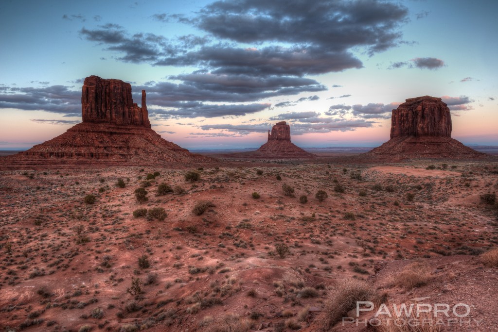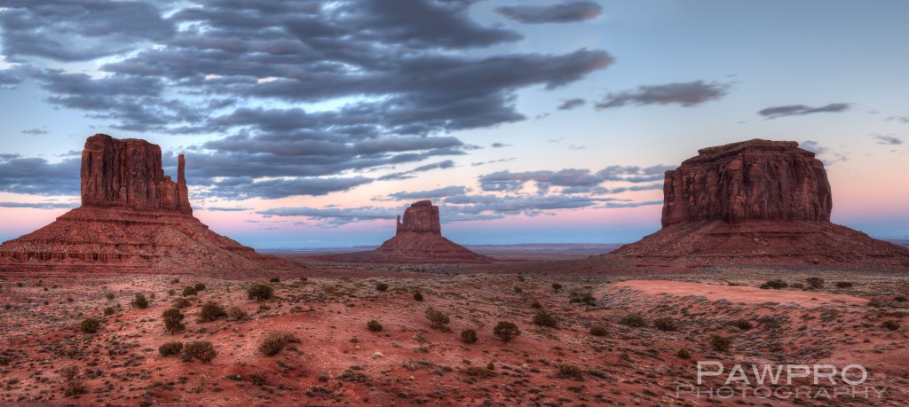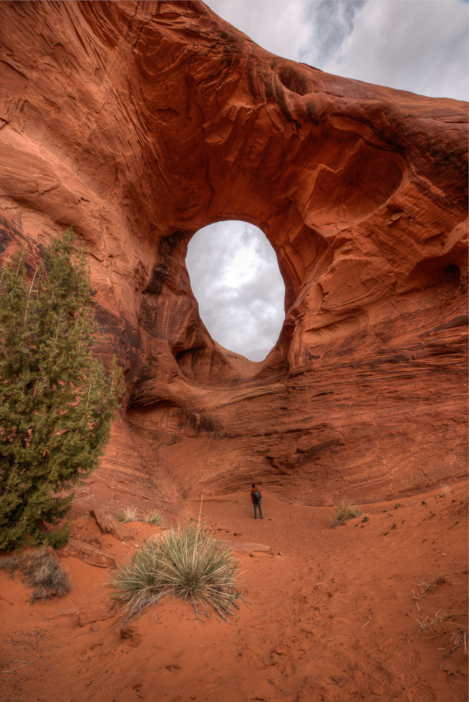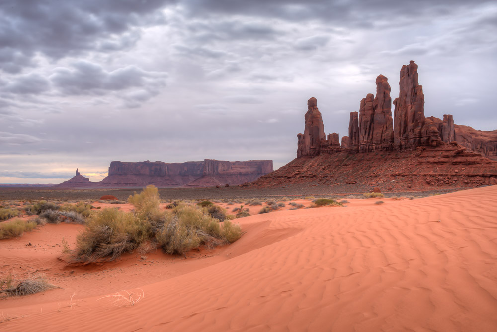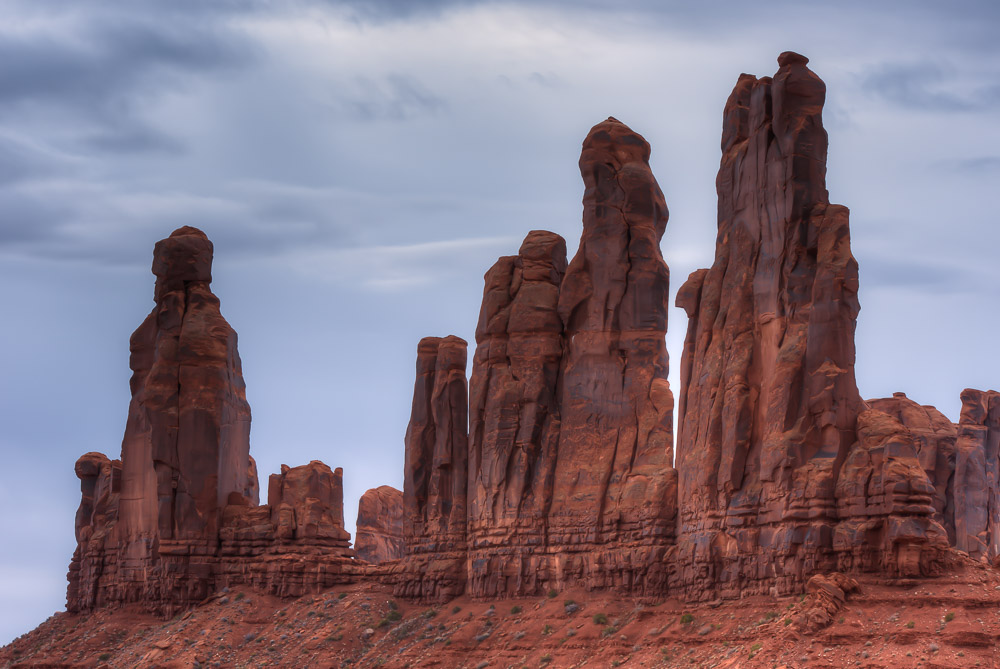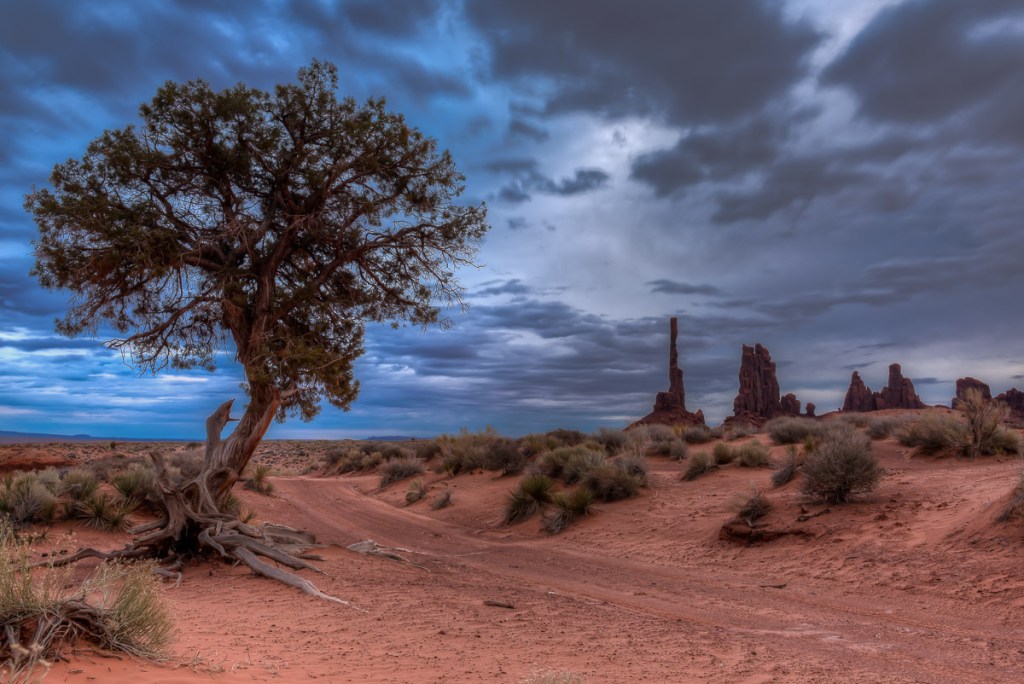 I scheduled a guide with Phillips Photography Tours for sunrise. Tule (pronounced like the Swedish car box brand) met me in the lobby of the hotel and within minutes we were headed down the dirt and gravel road beyond where tourist are allowed to venture on their own. The mittens were starting to emerge from the darkness. The tour owner had been thorough enough to send me an email the night before to let me know the weather was likely to be very cloudy at our original meeting time, so we pushed the start time to a little later. Tule took me out to the Totem Pole, a red rock spire once, and probably last, climbed by Clint Eastwood as he filmed the movie Eiger Sanction in 1974. The film industry has had a long love affair with Monument Valley ever since John Ford started featuring the area in John Wayne Westerns back in the 1930’s. It was indeed a cloudy morning, so sunrise wasn’t much to brag about, but it didn’t matter. I spent several hours moving from spot to spot taking photos of the landscape and other details I found interesting.