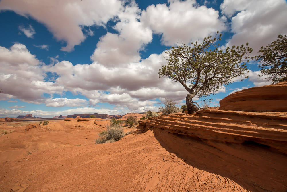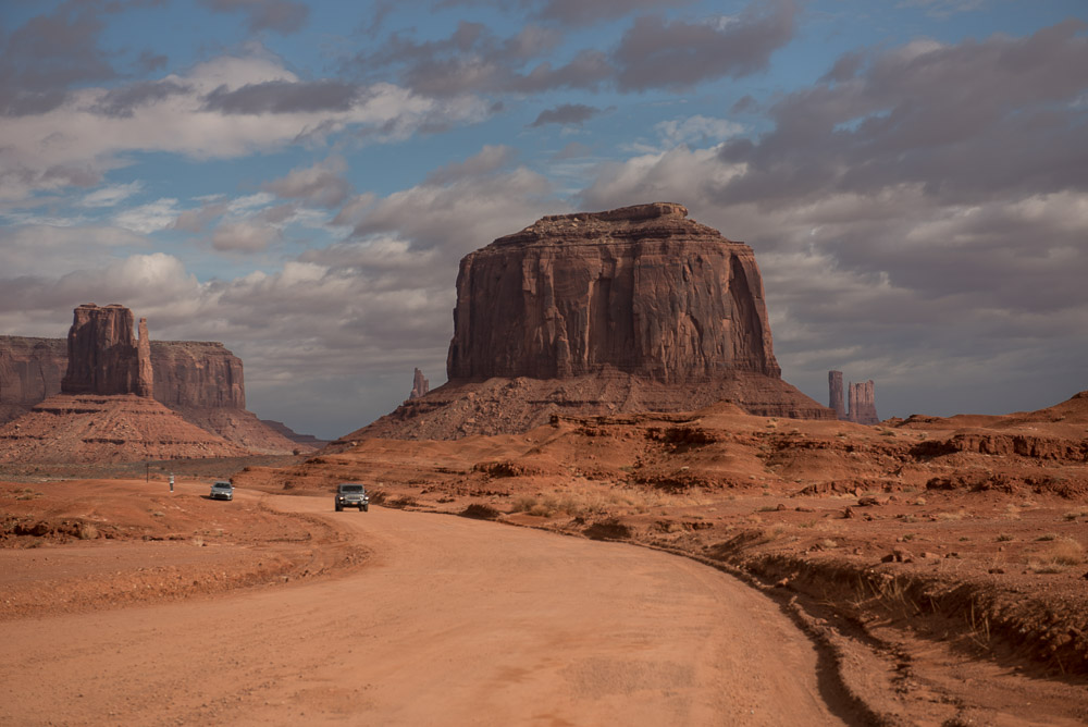 After lunch, Tule took me out for a second tour of a different area within Monument Valley. Slowly and carefully we made our way up to a higher vantage point. Somehow he maneuvered the vehicle to the top of a mound that I wouldn’t have thought possible. What had started as a cloudy day had evolved into a John Ford Western worthy sky—sunny with patches of puffy clouds drifting between the vastness and the buttes providing a greater sense of drama and depth to my photos.