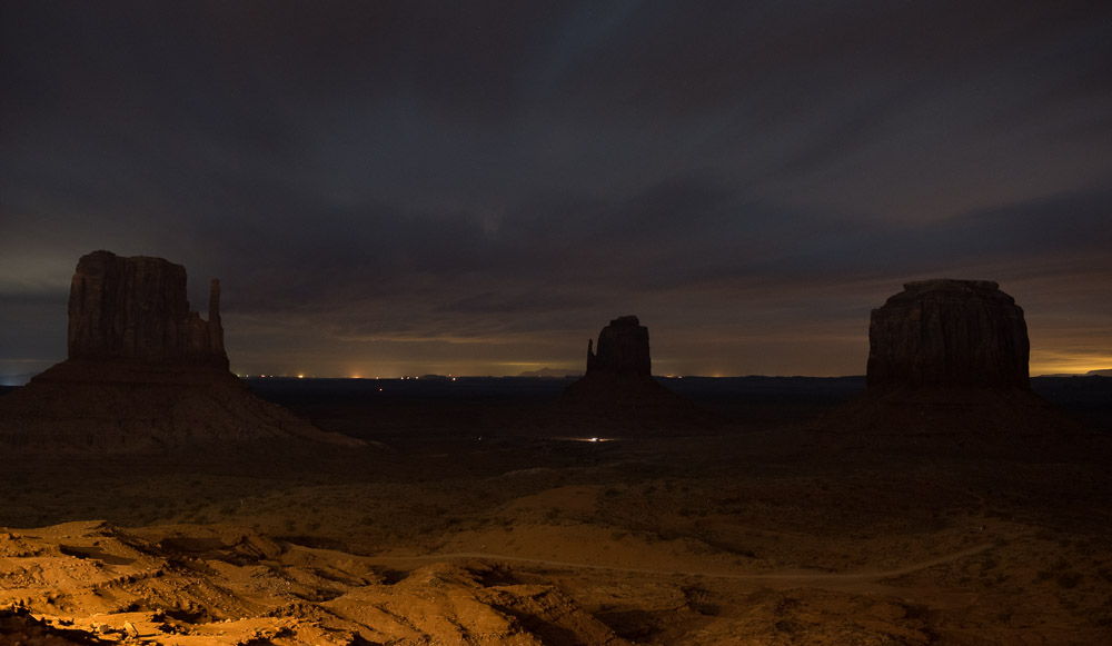 To be as close as possible to the formations, I chose to stay at The View Hotel, perched perfectly atop a plateau overlooking the famous buttes that resemble a left and right mitten jutting out from the ground. From this vantage the two buttes are flanked on the right by Merrick Butte, each seemingly perfectly spaced from the other, but at different depths. I couldn’t help but attempt a nighttime shot from the balcony (each room has good view) because we arrived late and the sky is so dark the buttes are lost in the blackness. I knew they were out there.