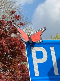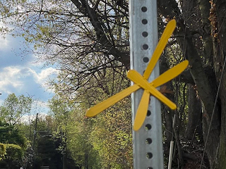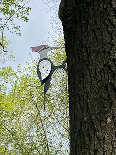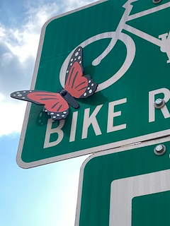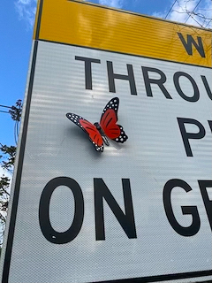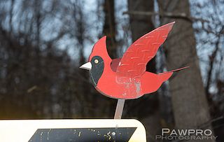 Of recent, the number of signs has increased, or maybe I just wasn’t paying attention for a while. Whatever the case there are a lot more of them, and the artisan has added a few designs to the mix, and improved the construction of these little works of art. He or she has switched to using painted, machine metal rather than wood, which was the material of choice in years past. Many of the wooden signs deteriorated and have been lost. In particular, there was an owl that I loved seeing. (Not going to tell you where it was.) I might also add, this person has some climbing ability because some of these mounts are not easily reached. There are also signs related to breast cancer awareness and snowflake shapes that may or may not be from the same person, but I haven’t included them.