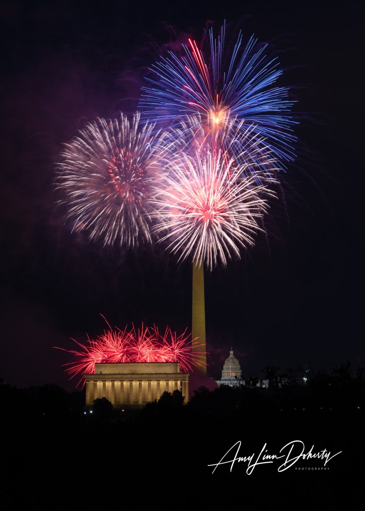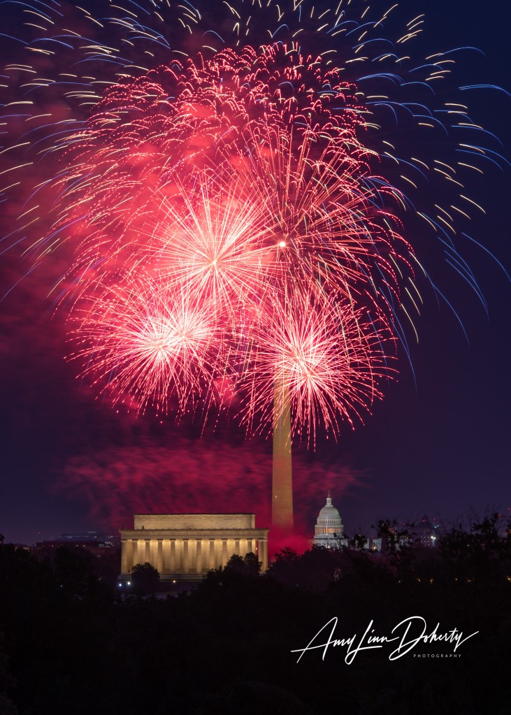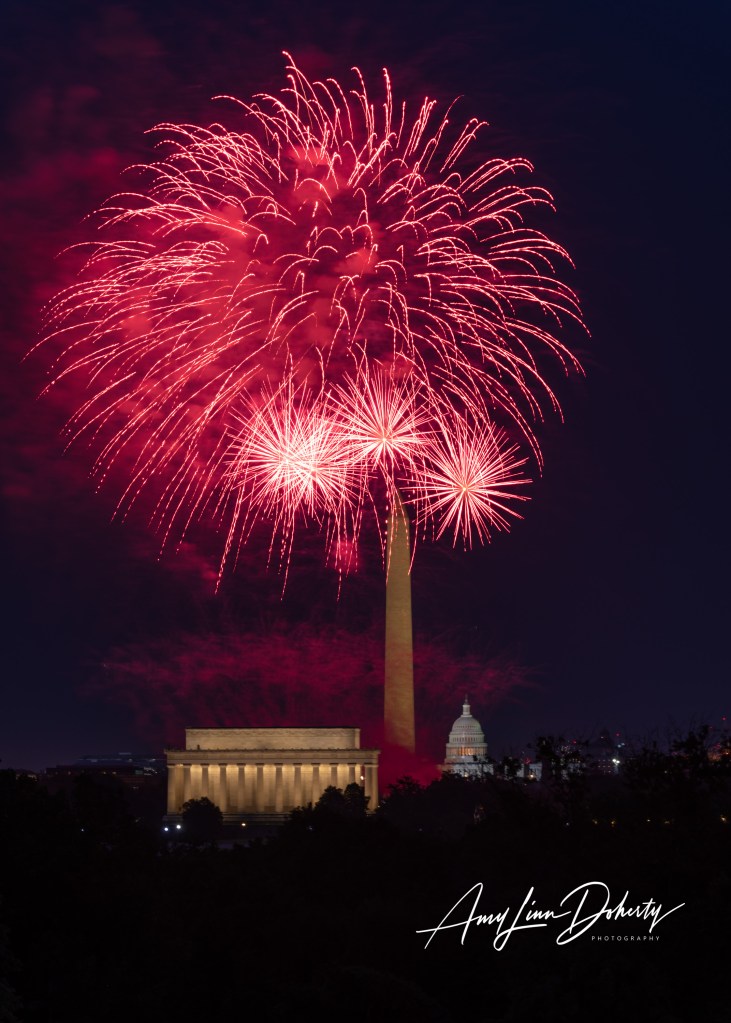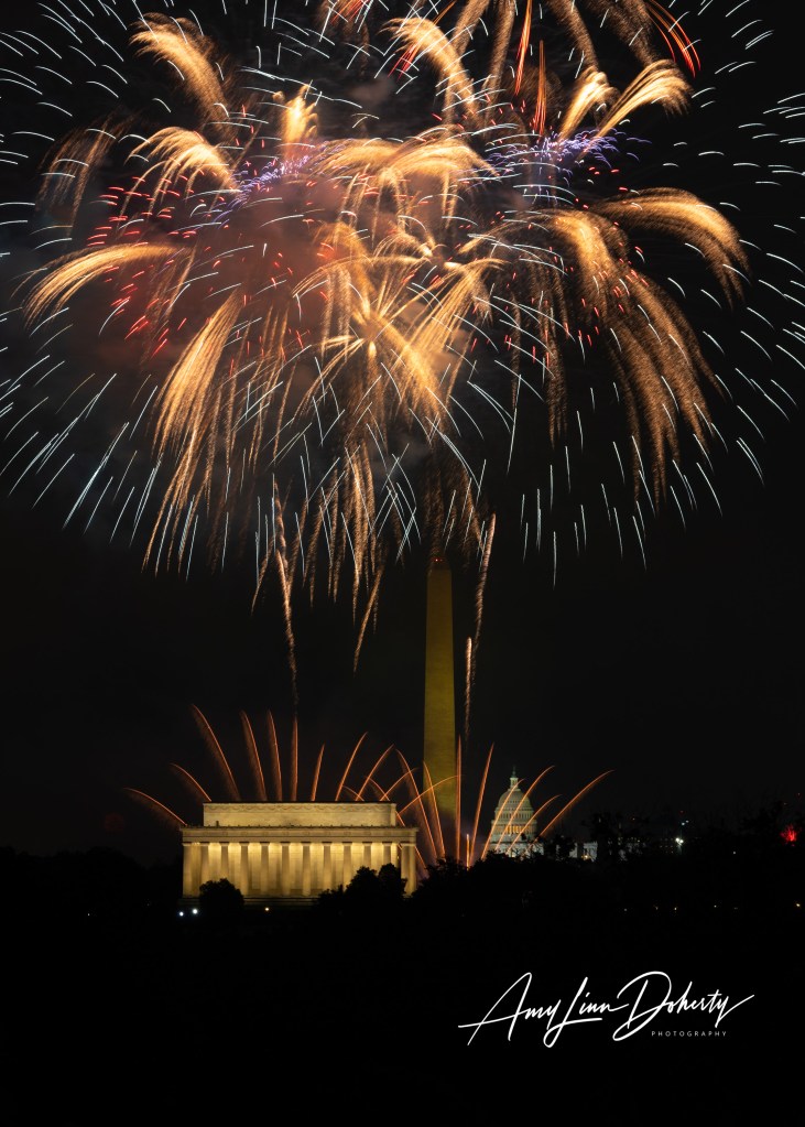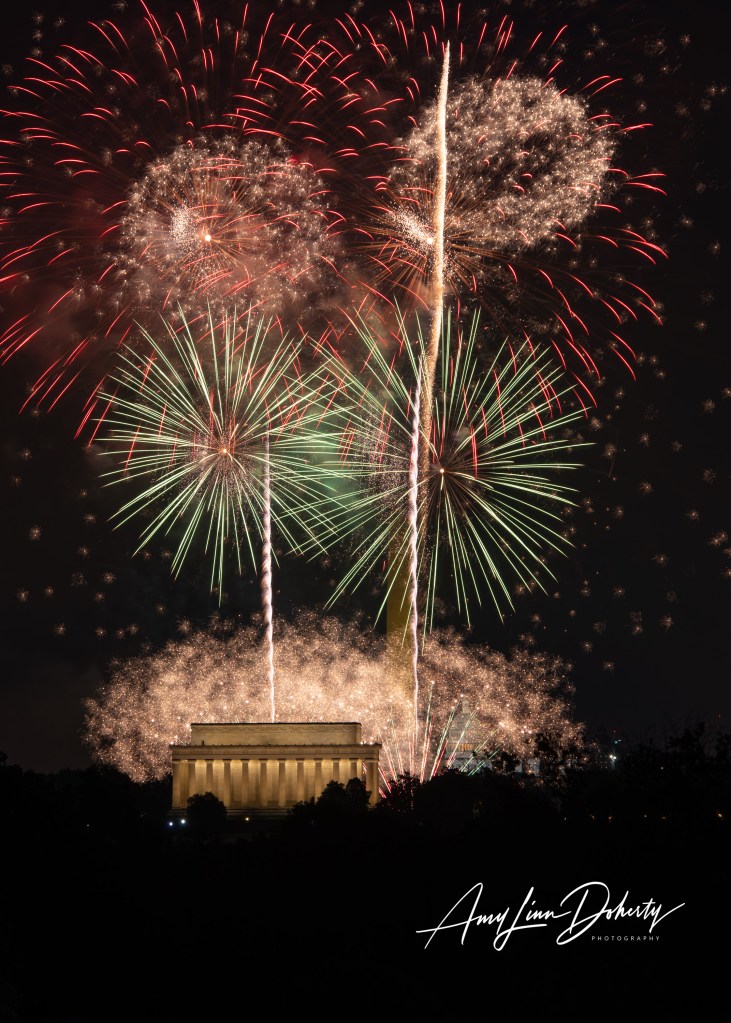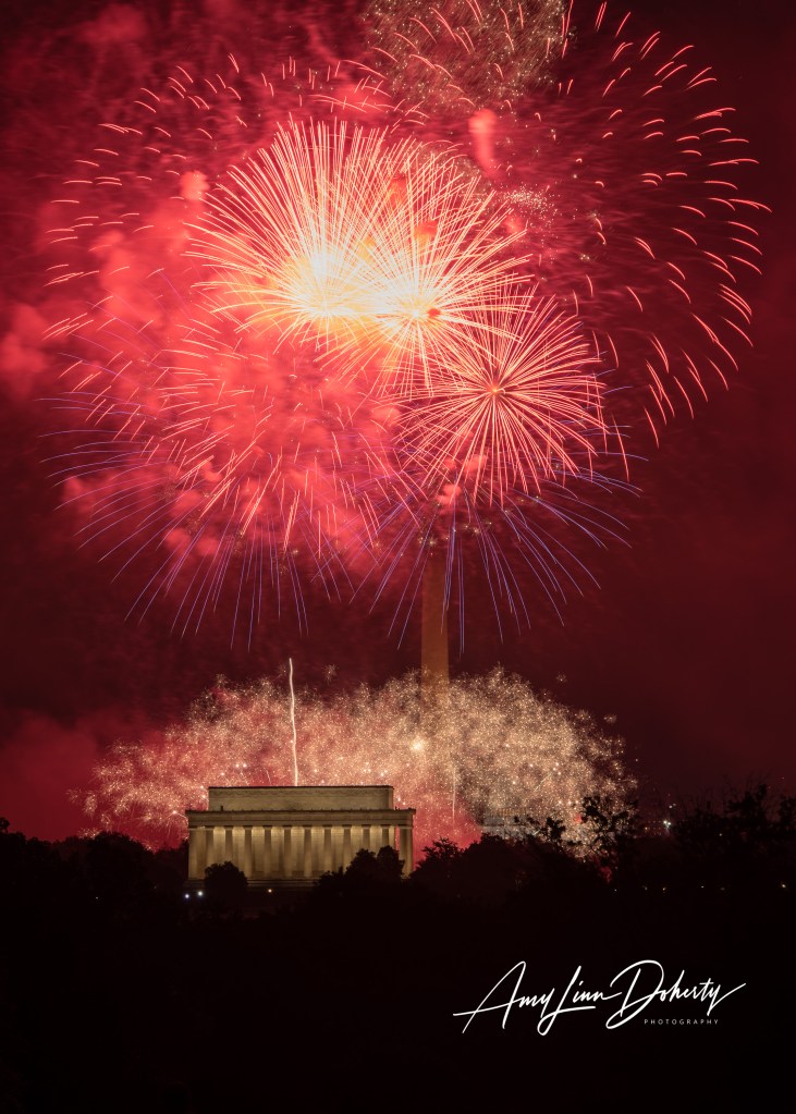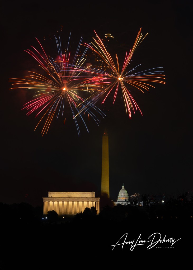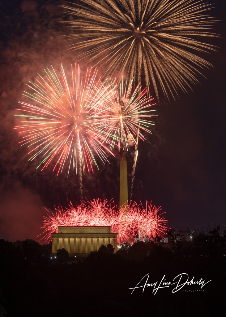 Definitely, a big crowd for this year’s fireworks up by the Netherlands Carillon overlooking the DC skyline. I had to navigate around a lot of heads, so I only walked away with a handful of decent shots. My bad, I chose poorly in my positioning. Never again in that spot!! Also distracting was a lingering helicopter centered over the Lincoln Memorial in the middle of the show. I don’t know if the helicopter contributed to the smoke that hung in place and dulled many of the bursts. It’s not unusual for a helicopter to be in the vicinity during the show, but it is unusual for it to center itself over the Lincoln Memorial, as it did. It was so much a part of the show from this vantage, I framed it in a few shots.